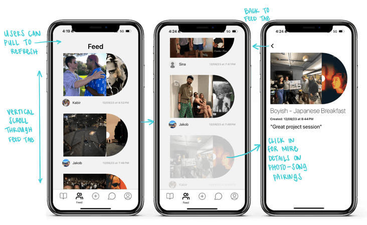 A photo surfaces from your camera roll. You pair it with a song that captures the feeling of that moment. You add a thought — or leave it as is. The pairing shares to your friends. Over time, you revisit your own and your friends' pairings.