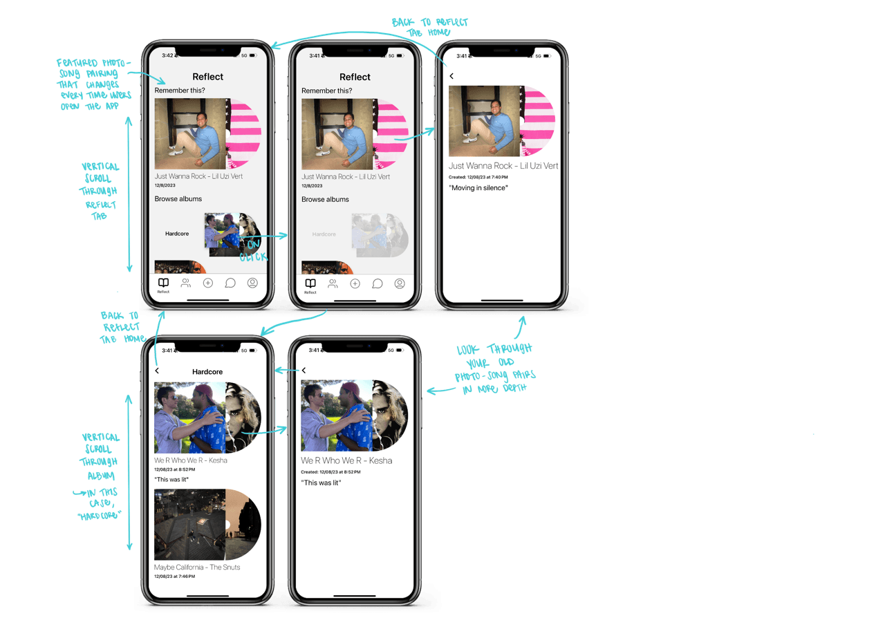 The Reflect page surfaces previously created photo-song pairings— a featured memory at the top, with albums below organized by the genre and mood of the songs attached. Over time, this becomes a living emotional archive.